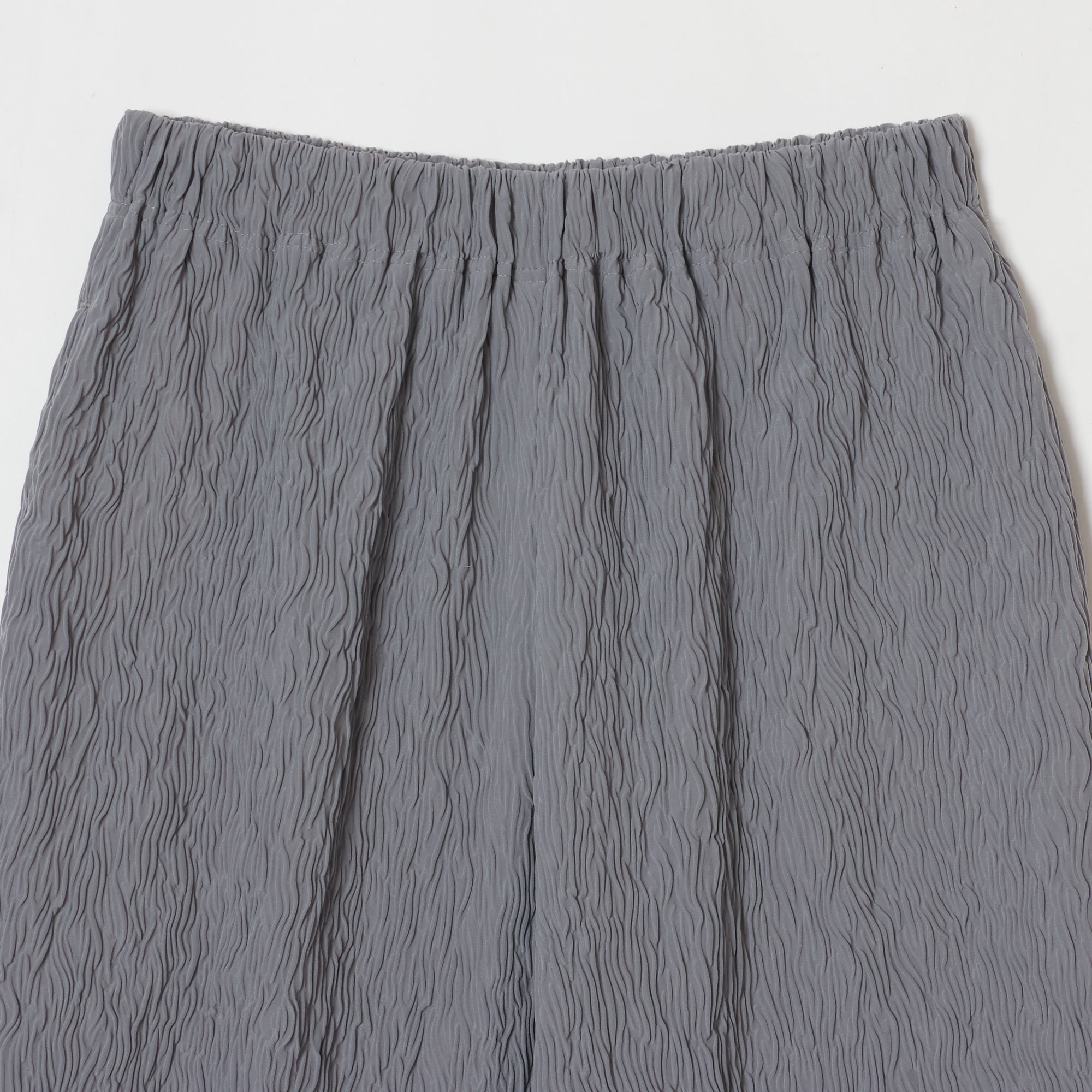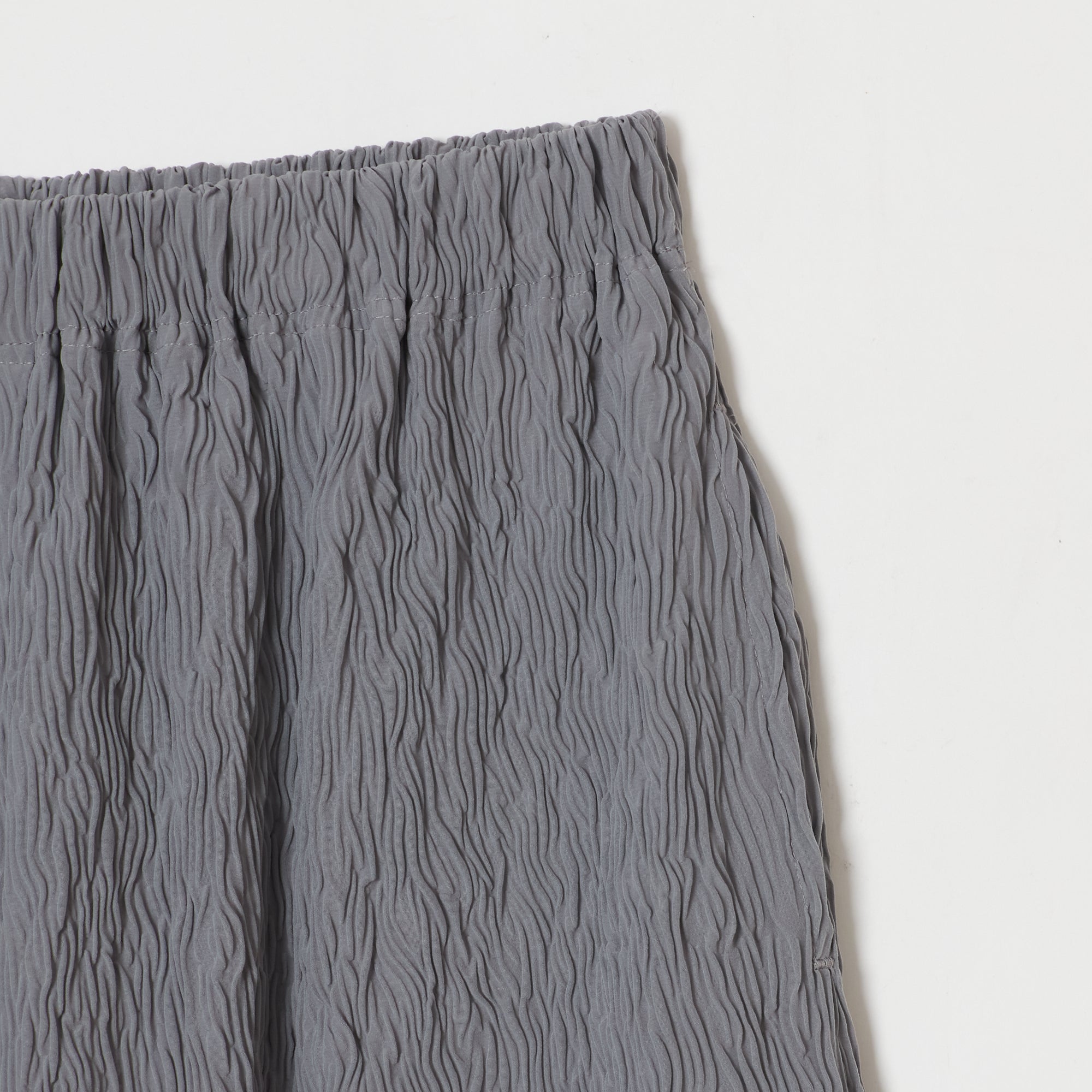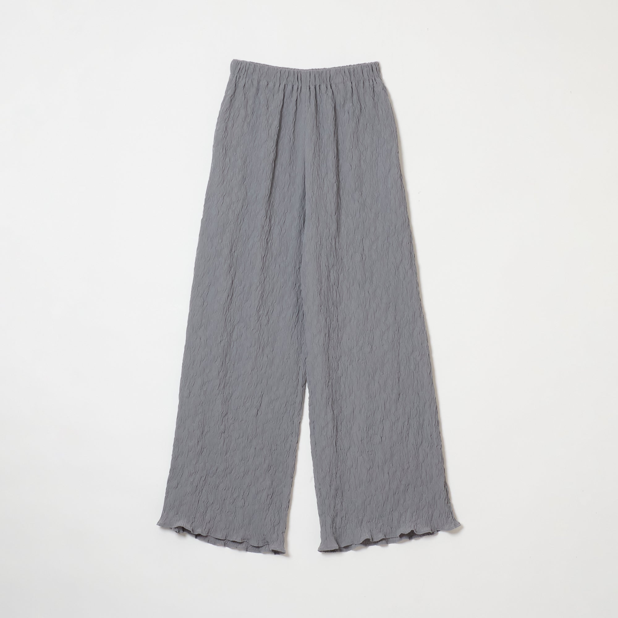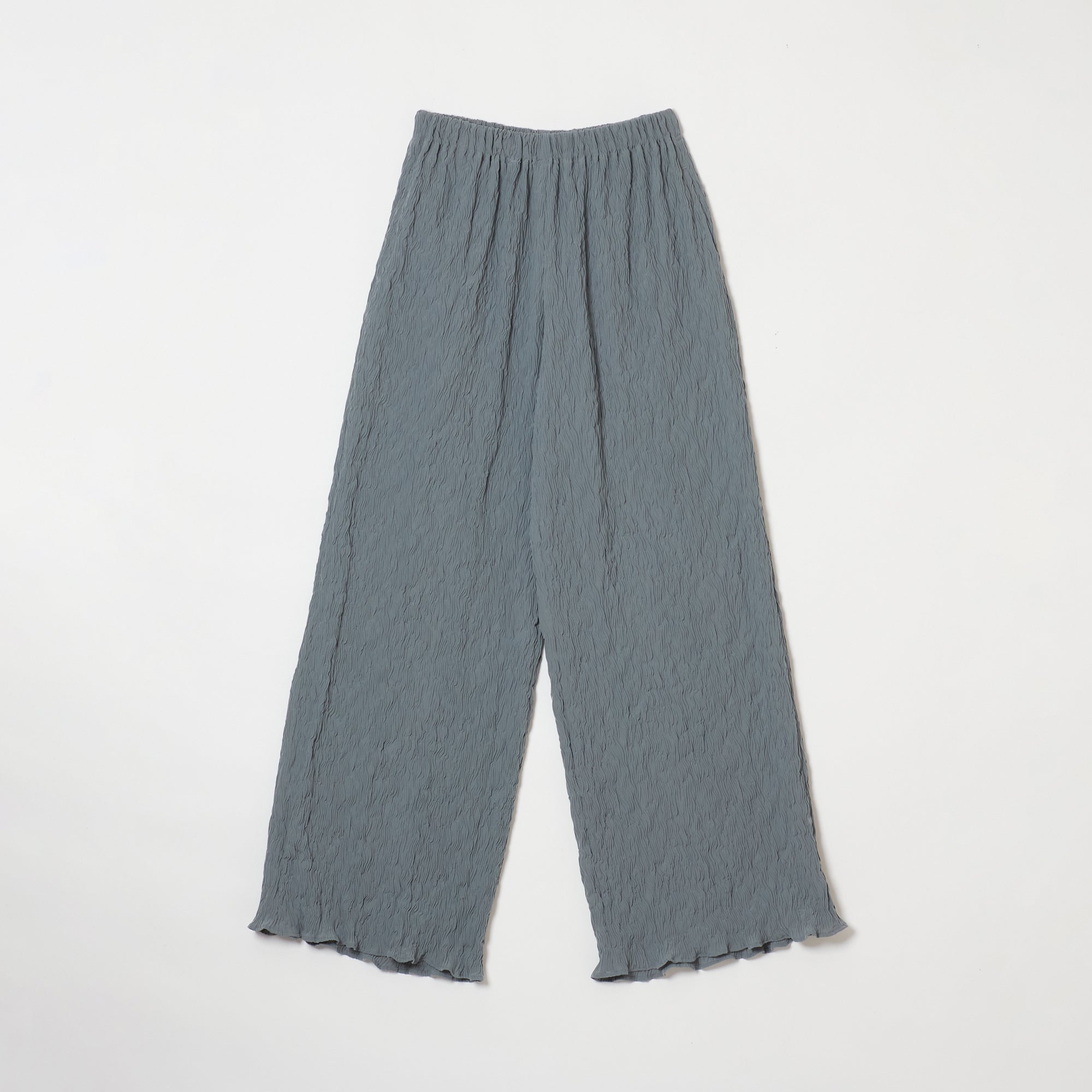 These are straight wide pants with pockets on both sides. The waist is elastic all the way around for easy wear. Wear them with a tight top for an outstanding leg-lengthening effect. The fabric has a “shrink finish” with random stripe-like ridges that resemble the Moku (wood grain) Shibori pattern, making it relatively cool to wear even in the hot season.