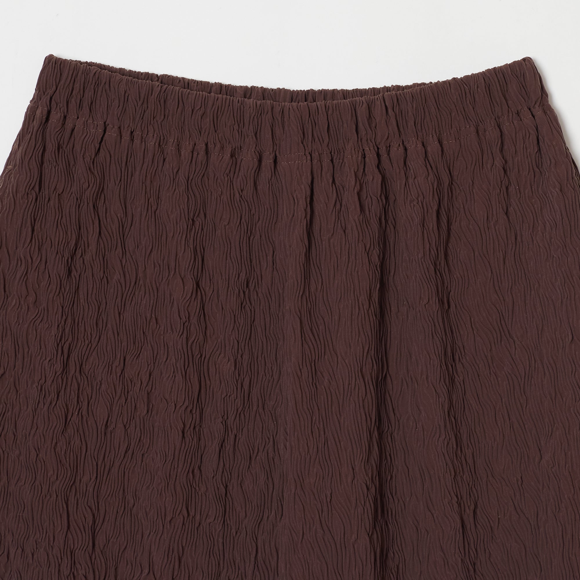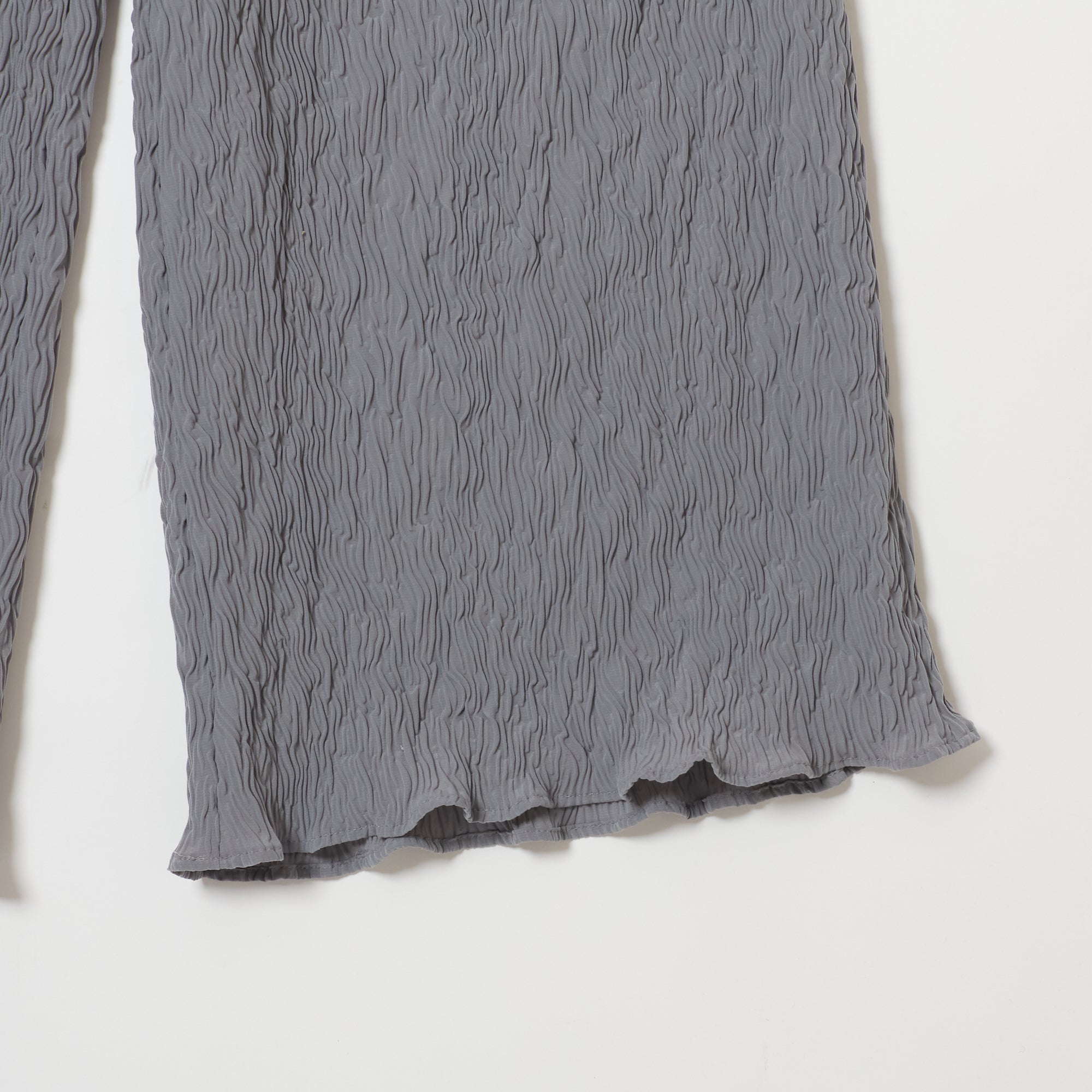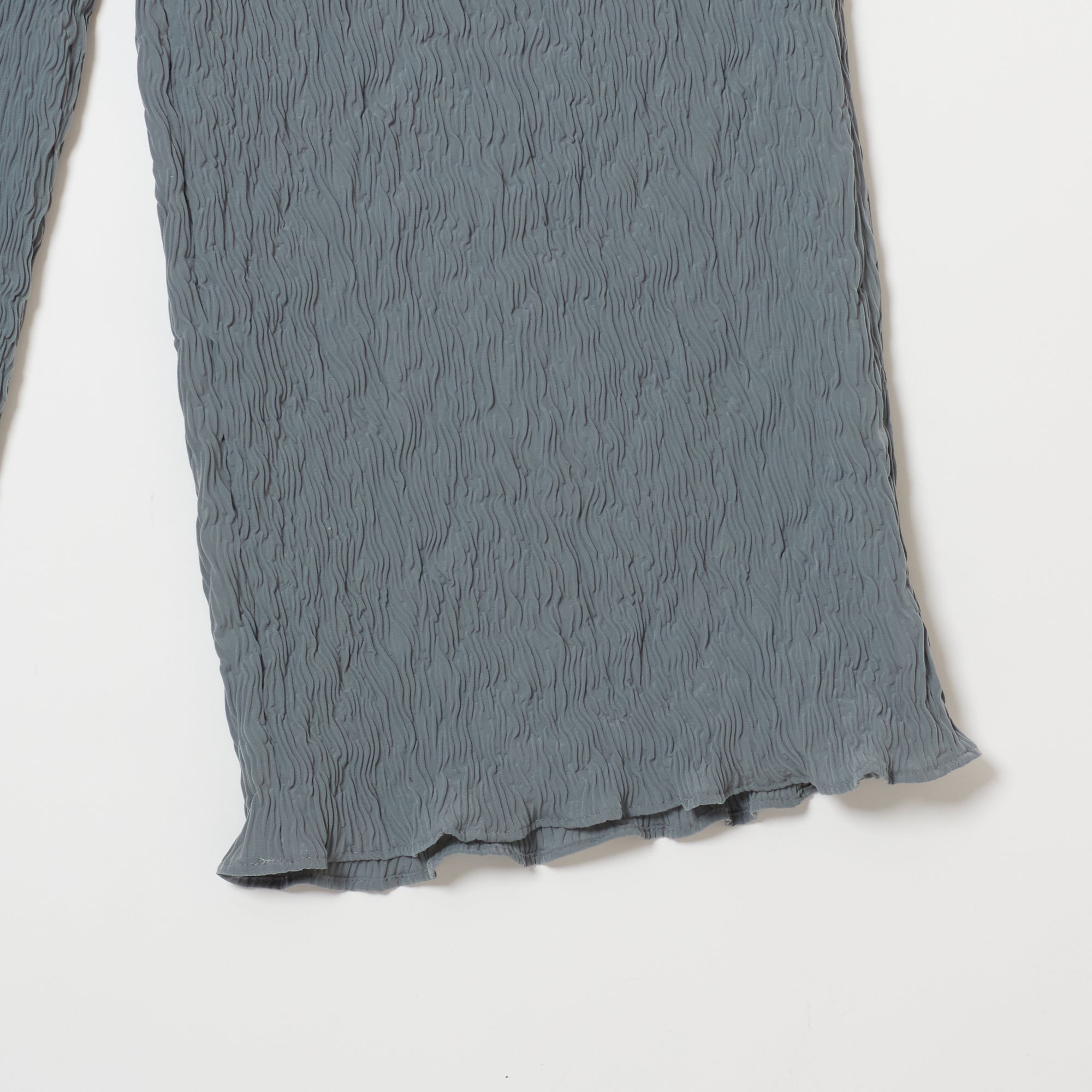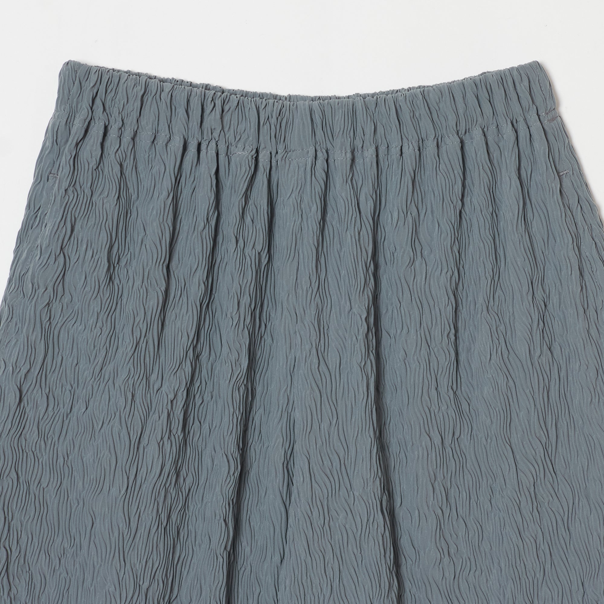 These are straight wide pants with pockets on both sides. The waist is elastic all the way around for easy wear. Wear them with a tight top for an outstanding leg-lengthening effect. The fabric has a “shrink finish” with random stripe-like ridges that resemble the Moku (wood grain) Shibori pattern, making it relatively cool to wear even in the hot season.