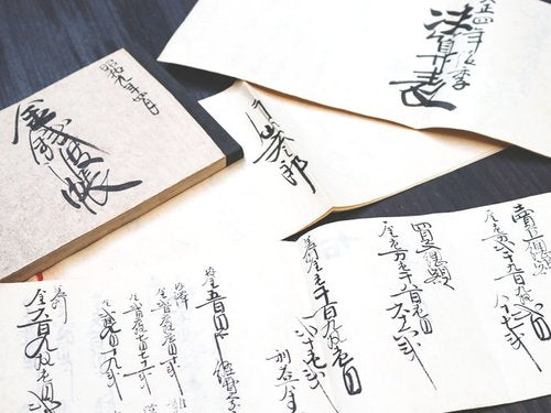 The signage of our main flagship store in Kyoto that reads "Katayama Bunzaburo Shoten" written in black calligraphy ink was originally written vertically by Bunzaburo, who was also an excellent calligrapher. Kazuo, the current president of the company, deconstructed each letter and rewrote them horizontally in the 2000's in response to his prediction for the globalizing market. Many of Bunzaburo's free-spirited characters can be seen in the old Daifukuchou, account books, of the time when company was founded. Bunzaburo's unhindered brushstrokes are truly fascinating - boldly as if dancing and has the expressive strength and powerful presence of words.
