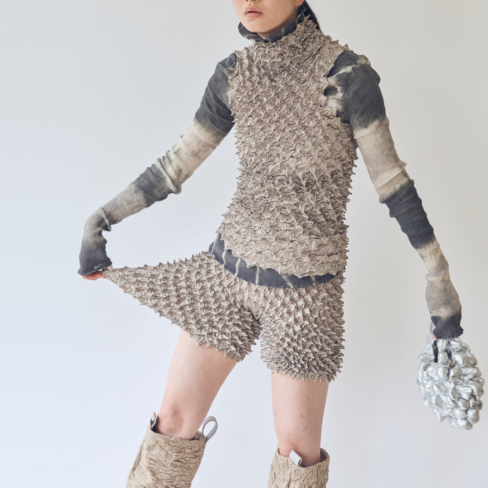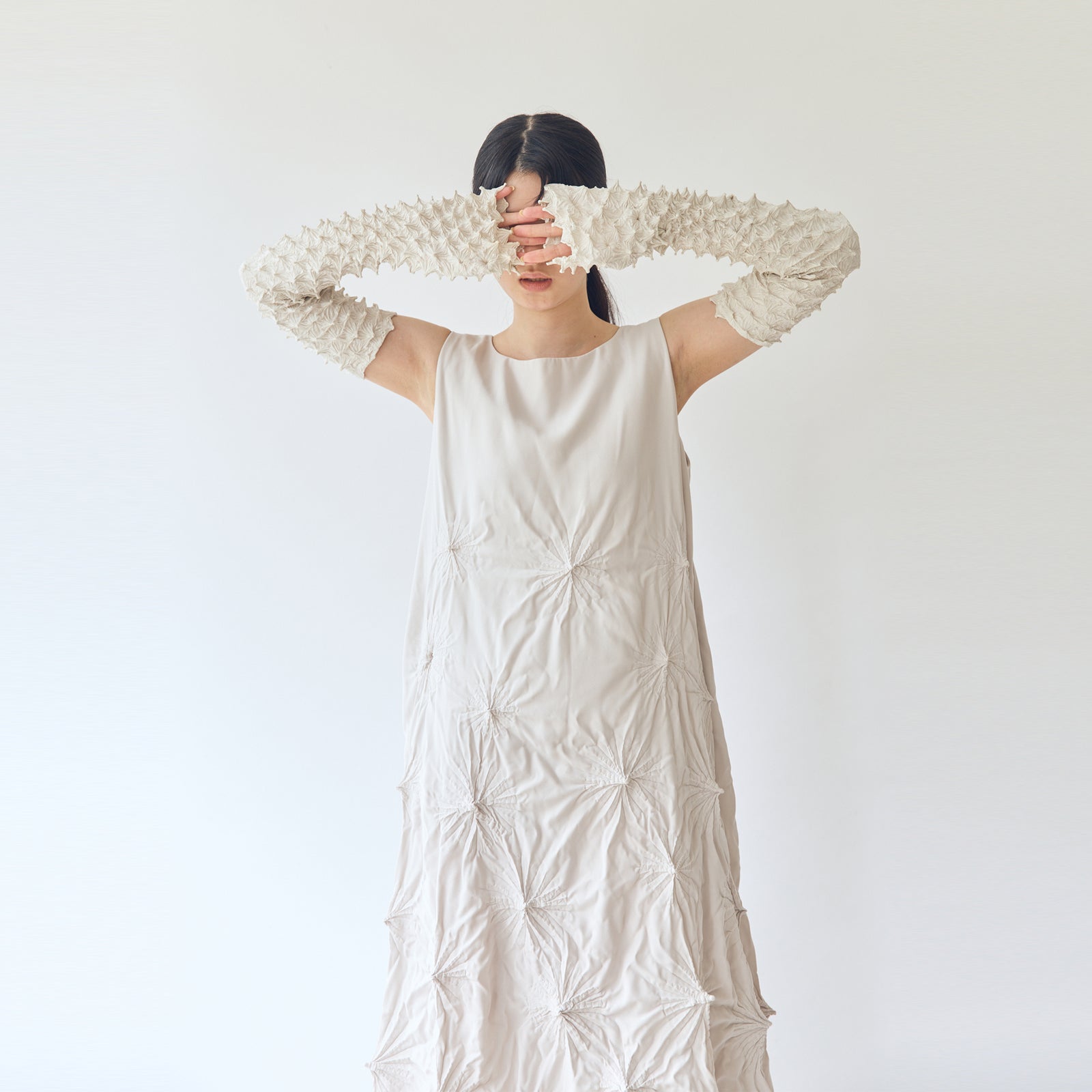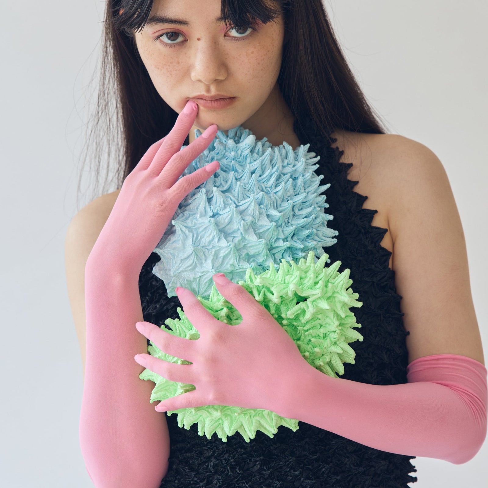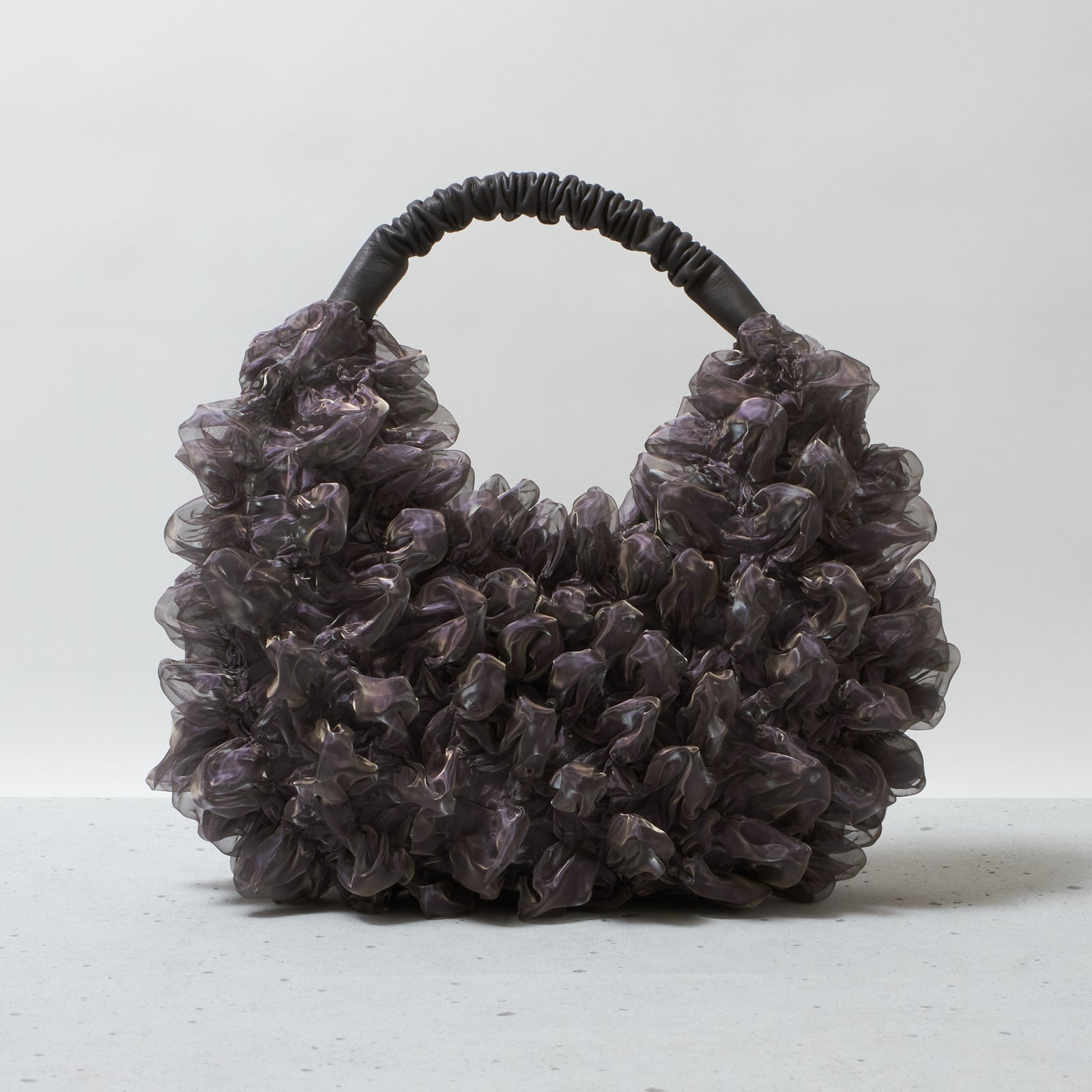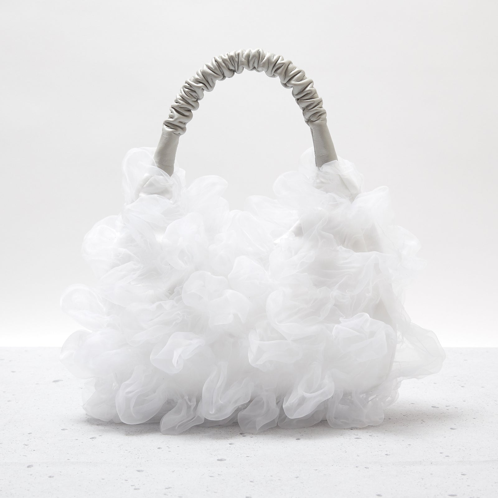 We have crafted an exceptionally lightweight bag using elegant polyester organza fabric with a sophisticated rainbow iridescence, adorned with a soft, cloud-like shibori texture. The delicate and elegantly shimmering WATAKUMO bag is a masterpiece of unforgettable beauty at first glance.