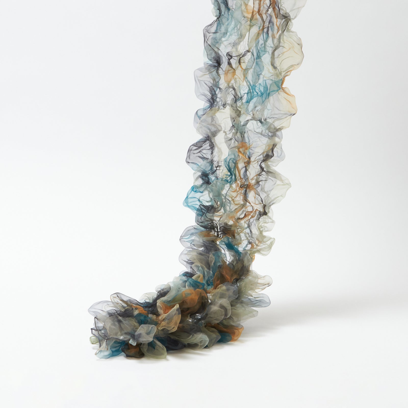 A tie-dyed scarf shaped like a cloud floating softly in the sky, made of polyester fabric so thin that it is transparent. The fabric is pinched into large chunks and tied only at the bases. The transparency creates endless nuances.