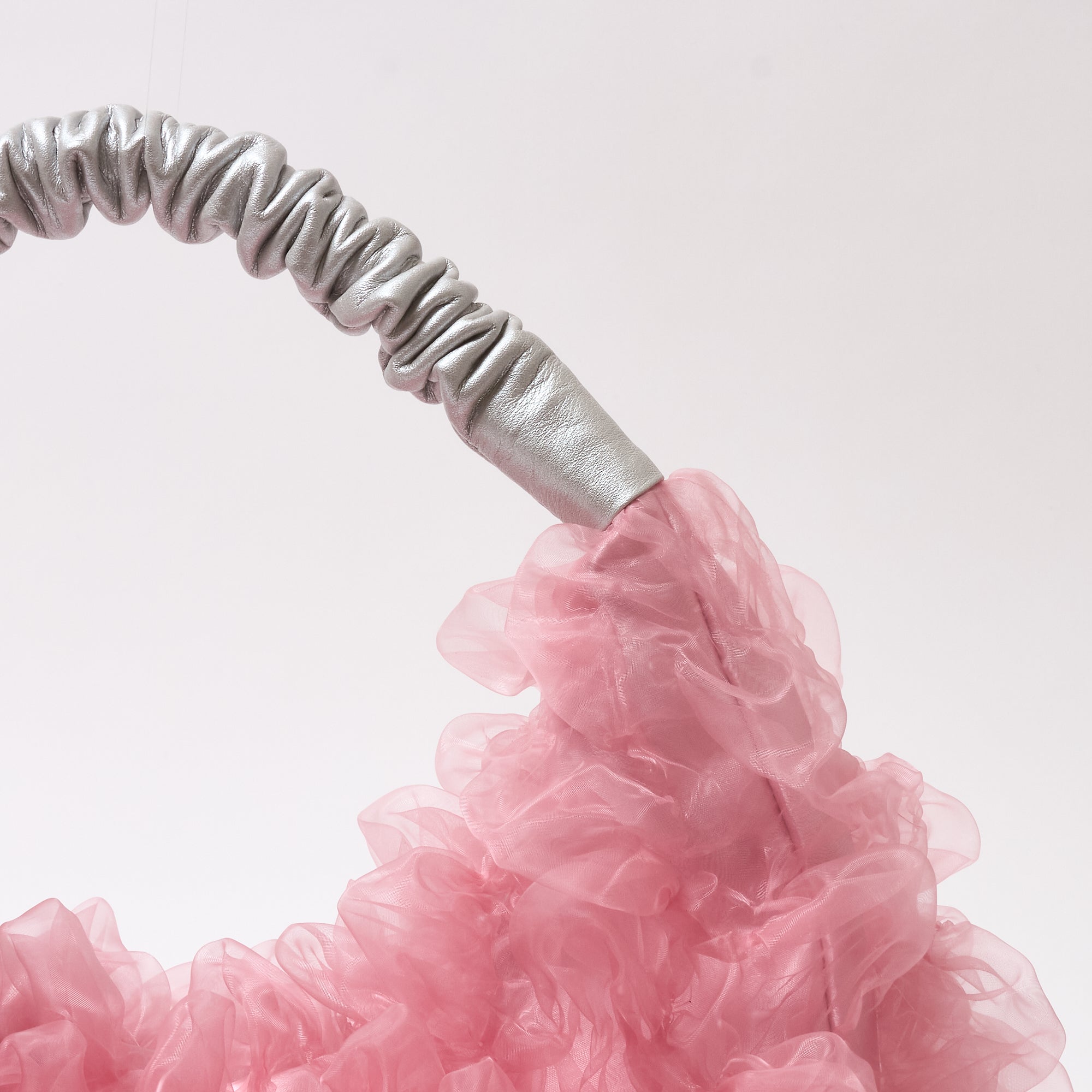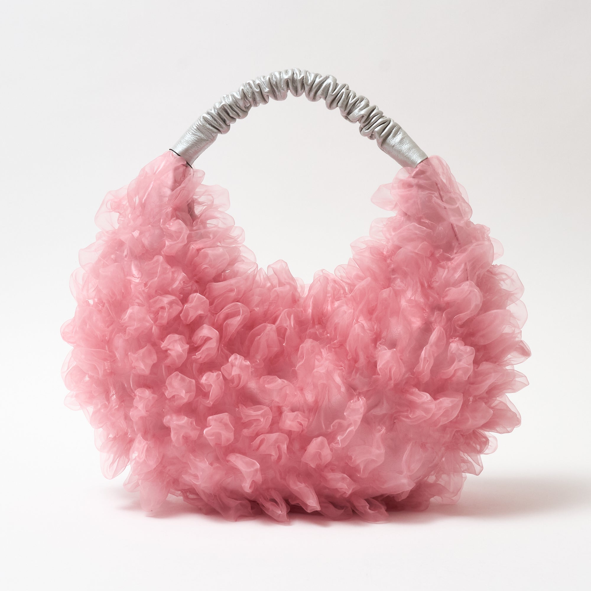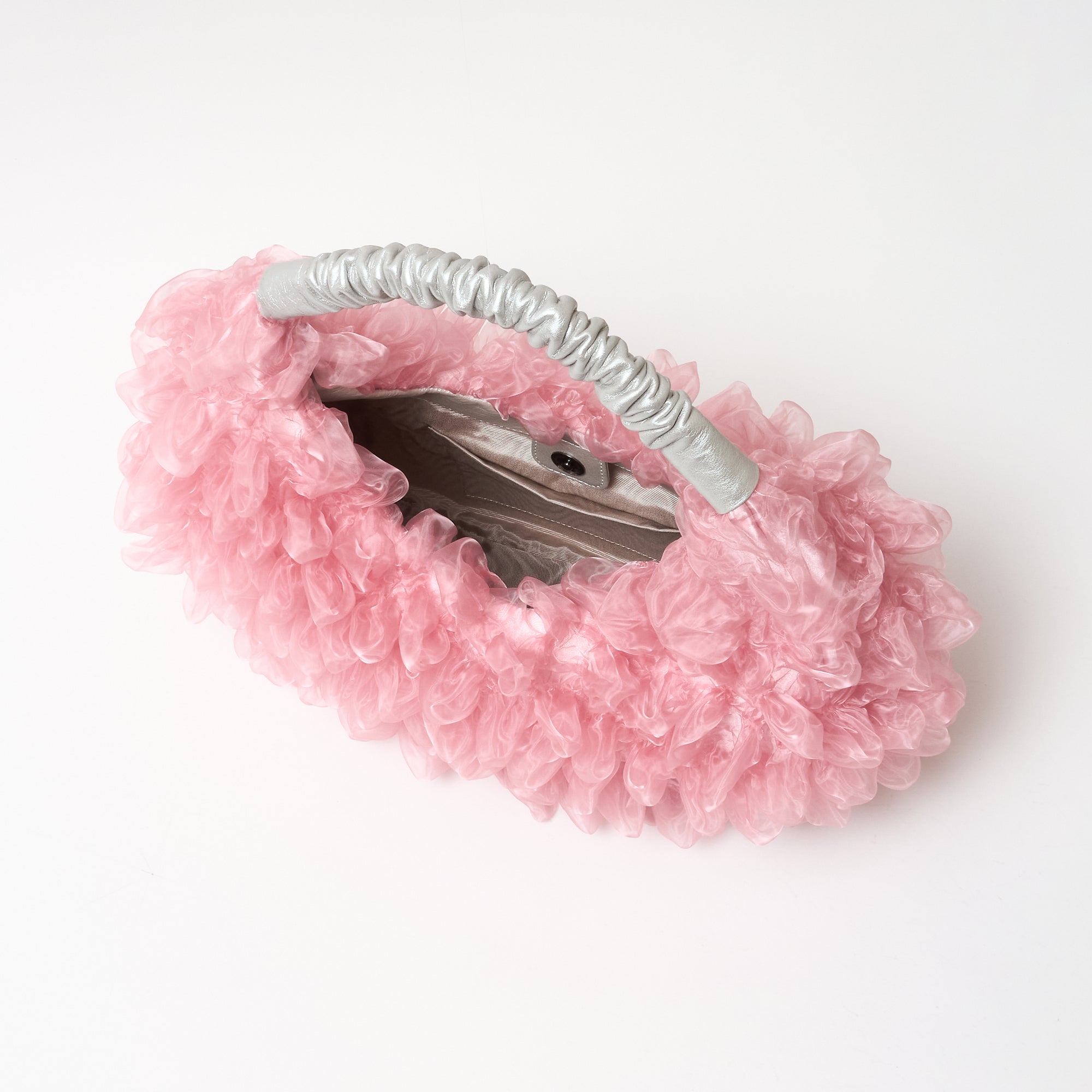 上品な虹色光彩が魅力的なポリエステルオーガンジー生地に、空に浮かぶ雲のようなふわふわとした絞りを施し、極めて軽いバッグを仕立てました。繊細で上品に輝くWATA-KUMOバッグは、一度見たら忘れられない美しさです。中にはジッパー付きとオープンの大きなポケットをひとつづつ備え、印象的なフォルムと同時に、実用性にも長けているのが自慢のポイントです。